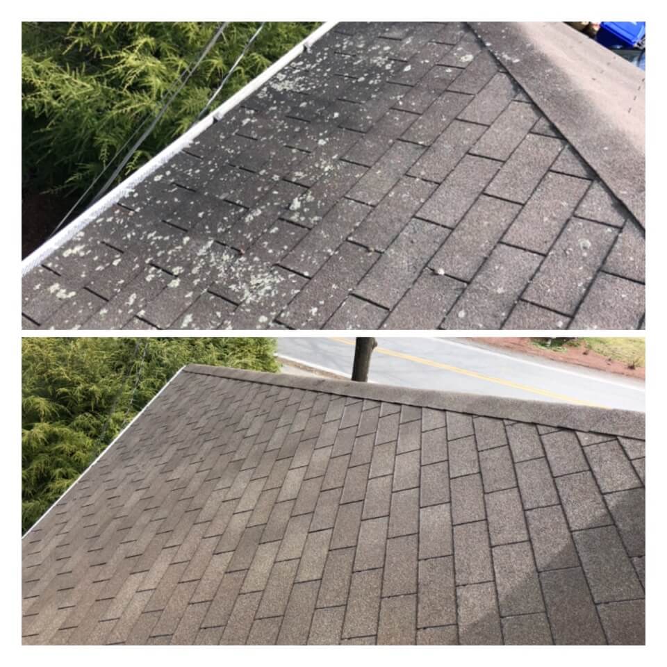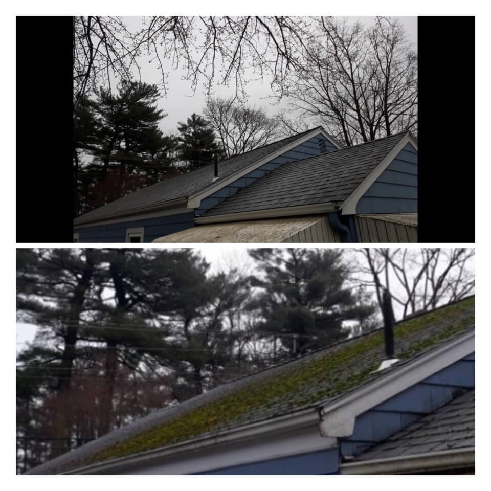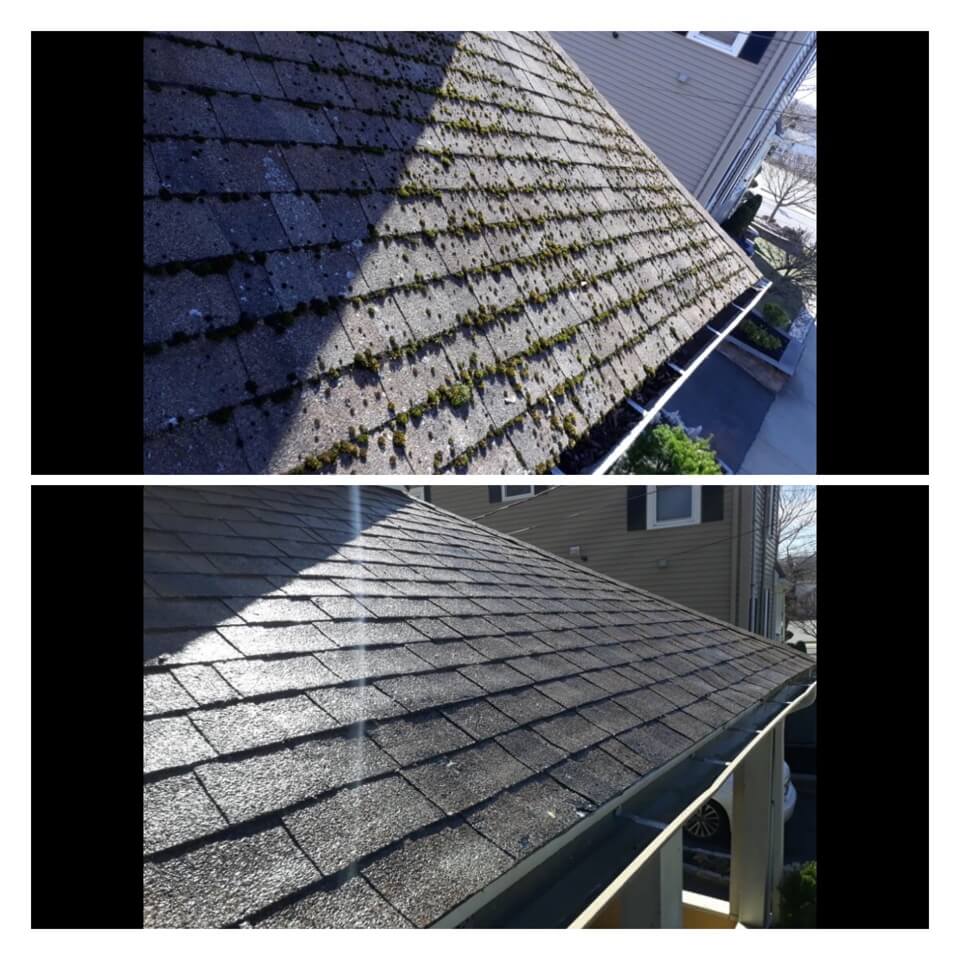 HiCleaners is the most experienced company in Mendon, MA that deals with roof washing and roof soft washing. All of our employees are trained to recognize precise solution mixing ratios to provide you with the safest and most effective soft washing service. Roofs are a commonly neglected part of a house due to the fact that most people don’t have ladders to access it, so it is very easy to just leave it alone and forget about problems that may start to arise. Just like many home owners, discoloration and small bits of moss on a roof can be overlooked because of the misconception that it is just aesthetic. However, it isn’t just aesthetic, the moss slowly lifts the granules off the shingles which in turn shorten the life of the shingle. The moss also spreads, just like any bacteria if it is left alone for too long, it can quickly become a problem that spirals out of control. Call HiCleaners for a free quote, we only use the most advanced eco-friendly solutions and equipment to make sure the job is done right, for the safety of the employees, your plants, grass, pets, and children.